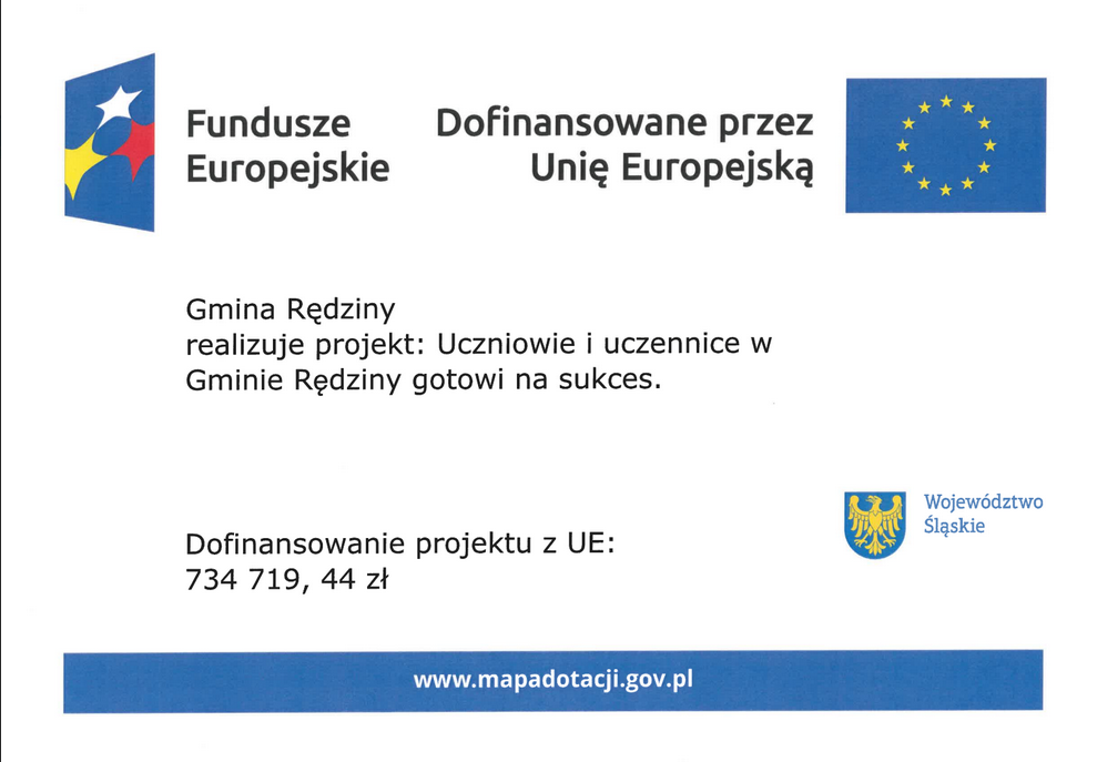 - Projekt pod nazwą „Uczniowie i uczennice w Gminie Rędziny gotowi na sukces”, numer projektu: FESL.06.02-IZ.01-0AF1/24-002, współfinansowany ze środków Europejskiego Funduszu Społecznego + w ramach Fundusze Europejskie dla Śląskiego na lata 2021 -2027